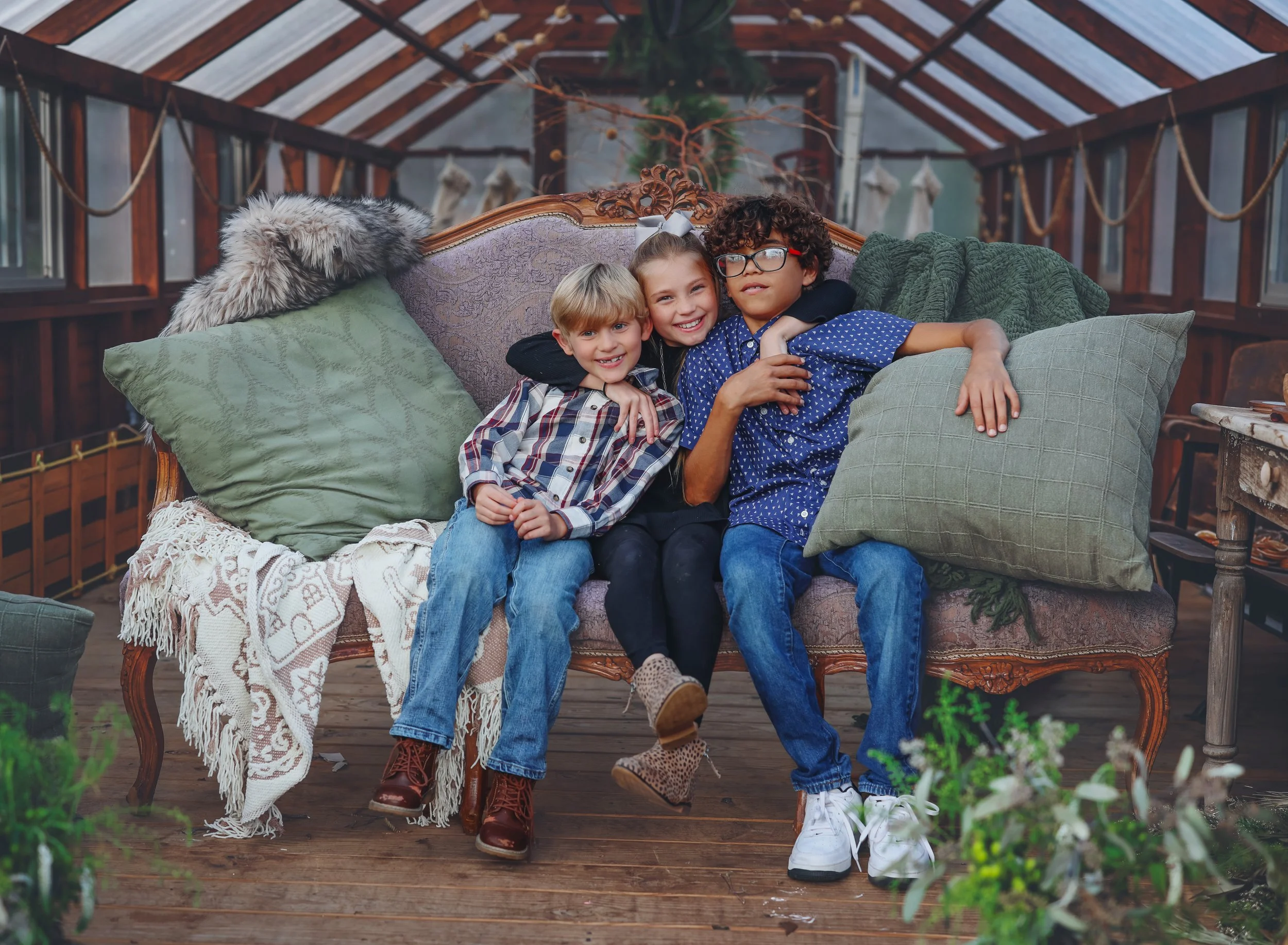 This year, I had the honor of photographing Derek and Jacklynn Brown and 3 of their 4 beautiful kiddos at The Cosmo Cottage Farm, surrounded by places that feel deeply personal to me: the greenhouse and the bird nest chair. The Bird Nest set is an artistic, sculptural scene I created three years ago—one that continues to evolve with time, weather, and intention. Much like family itself, it grows, shifts, and becomes richer with each passing year.